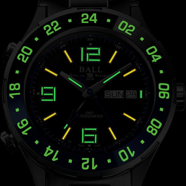 仕様:時・分・秒表示、日付表示、第2時間帯(GMT)表示、針・文字盤に27個の自発光マイクロ・ガスライト、反射防止処理済みのサファイアガラス、片方向回転式セラミックトップ・ベゼル、耐衝撃性 5,000Gs(高さ1.0mから自由落下にて木の床に落とした時に受ける衝撃と同等の衝撃テストを実施)、シースルーケースバック